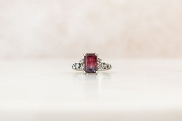 Embrace the captivating beauty of the Northern Lights with this platinum ring, featuring a stunning 2.42ct bi-colour tourmaline that shifts from deep purple to radiant pink. Enhanced by a cluster of sparkling natural diamonds, this exquisite piece combines vibrant hues and timeless elegance, perfect for those who appreciate refined luxury and unique craftsmanship.