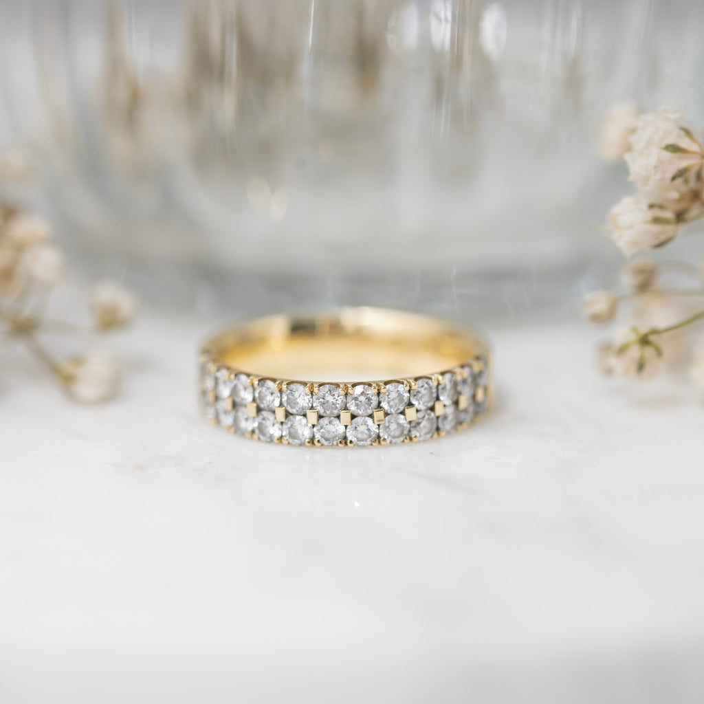 This 18ct yellow gold band is a timeless piece of craftsmanship, boasting a 0.75ct total carat weight of pavé set diamonds. Ideal as an elegant wedding band or a standout everyday accessory.
