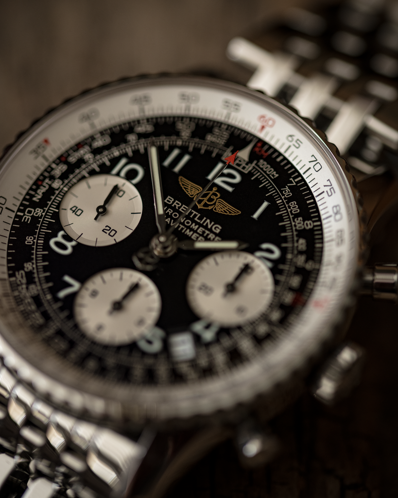 The Breitling Navitimer offers an elegant and sophisticated watch-wearing experience, constructed with a stainless steel frame and black dial.
