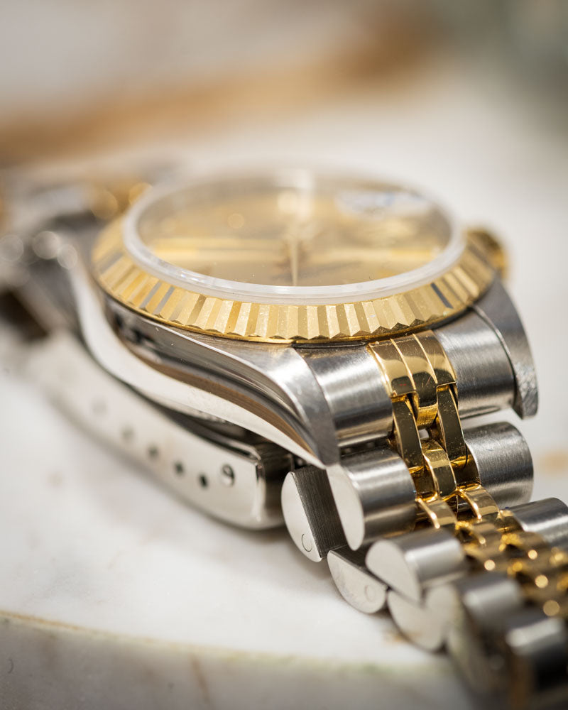 Crafted from high-quality 18ct yellow gold and stainless steel, this timepiece boasts a lustrous champagne dial. The dial, free from diamonds, presents a sleek, minimalist look, allowing the golden numerals and hands to take centre stage.