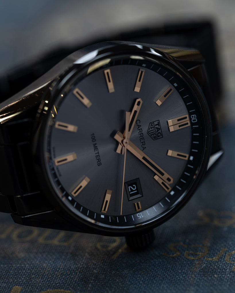 The watch features a sophisticated grey dial encased in a durable 39mm polished stainless steel case completed with black PVD finish. The dial is accentuated by rose gold-tone markers and hands. A date window is conveniently placed at 3 o'clock for easy reference. The dial is covered by a scratch-resistant sapphire crystal, ensuring the watch's longevity and maintaining the clarity of the time display.