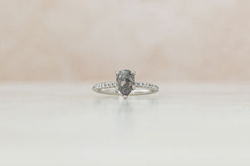 This bespoke platinum ring features a striking 1.28ct pear-cut salt and pepper diamond, uniquely showcasing natural character and depth. Its delicate diamond shoulder is thoughtfully modified to nestle perfectly alongside a wedding band, combining elegance with personalized design for a refined luxury statement.