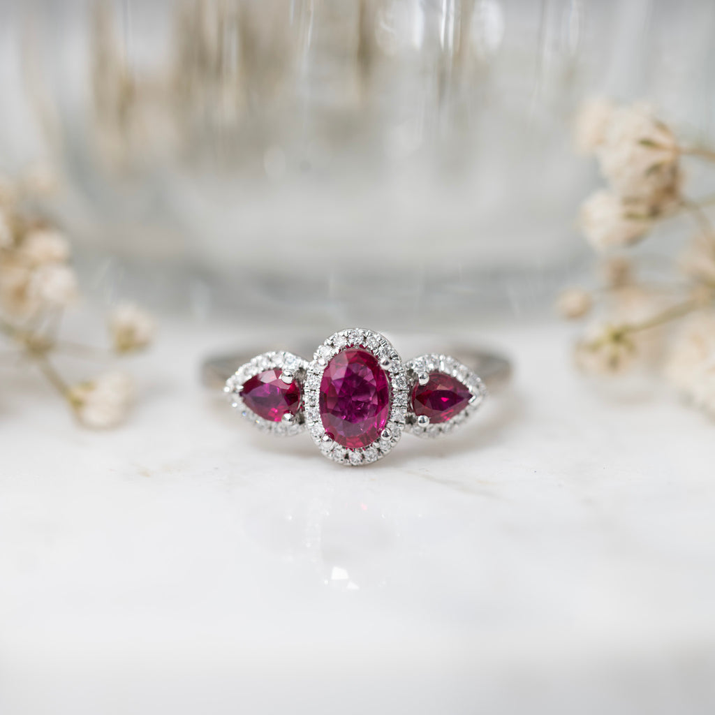 This stunning 18ct White Gold ring features a 0.87ct oval ruby centre and two pear shaped ruby side stones surrounded by a halo of 0.49ct round brilliant diamonds. The perfect gift for a wedding anniversary or simply if you love rubies, this stunning piece is sure to be treasured.
