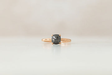 Elevate your elegance with this 9ct rose gold solitaire ring, featuring a striking 1.14ct cushion-cut dark grey salt and pepper diamond. Set securely in delicate talon claws, this unique gemstone combines modern sophistication with timeless beauty—perfect for those who appreciate refined luxury and distinctive style.