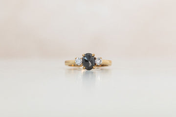 Elevate your elegance with this 9ct yellow gold trilogy ring, featuring a 0.88ct oval cut dark grey salt and pepper diamond at its center. Accented by brilliant round-cut laboratory-grown diamonds, this piece blends unique natural beauty with modern luxury. Perfect for those who appreciate sophisticated style with an individual touch.