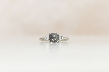 Crafted in exquisite platinum, this trilogy ring features a 0.92ct cushion-cut dark grey salt and pepper diamond, beautifully accented by two round brilliant laboratory-grown diamonds. The unique salt and pepper centre stone offers a captivating blend of character and elegance, while the sparkling side stones add brilliance and sophistication. Perfectly balancing modern luxury with timeless style, this ring makes a stunning statement for those who appreciate distinctive, high-quality craftsmanship.